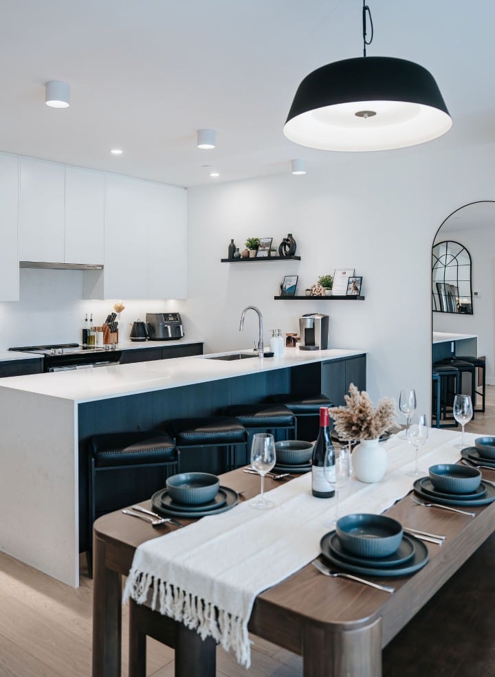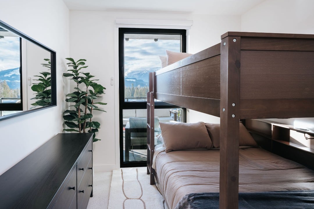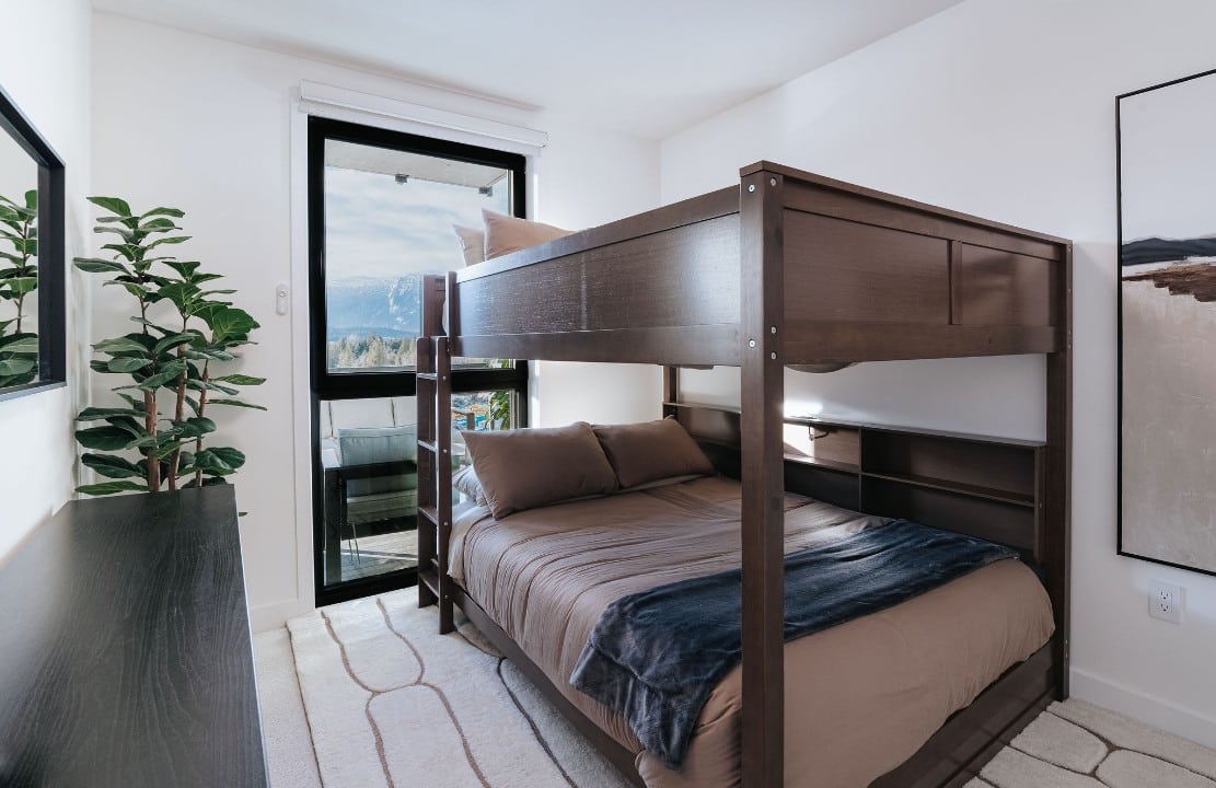 Sleeping Arrangements & Amenities Primary Bedroom: 1 King Bed Secondary Bedroom: 1 Queen over Queen Bunk Bed Lounge Room: Pull Out Sofa Bed (Double) Relax in the spacious living room, complete with comfortable seating and a smart TV for your entertainment. With two full bathrooms, there’s plenty of space for everyone to get ready with ease. For longer stays, the unit also features a washer and dryer for added convenience. The open-plan dining area and fully equipped kitchen make it easy to prepare meals and gather with family or friends after a day of adventure. On the rooftop, enjoy the communal space with cozy seating, hot tubs, and a BBQ—perfect for unwinding and taking in the stunning mountain views.