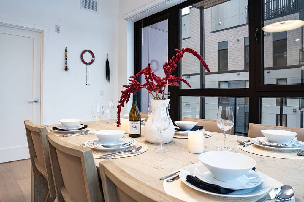 Relax in the spacious living room, featuring ample seating and a smart TV for your entertainment. With two full bathrooms, there’s plenty of space for everyone to get ready comfortably. For longer stays, the unit also includes a washer and dryer for your convenience. The open-plan dining area and fully stocked kitchen make it easy to cook meals and gather with family or friends after a day of adventure. On the rooftop, you’ll find a communal space with comfortable seating, hot tubs, and a BBQ, perfect for relaxing and enjoying the beautiful mountain views.