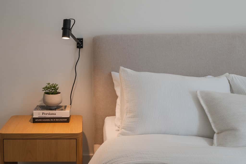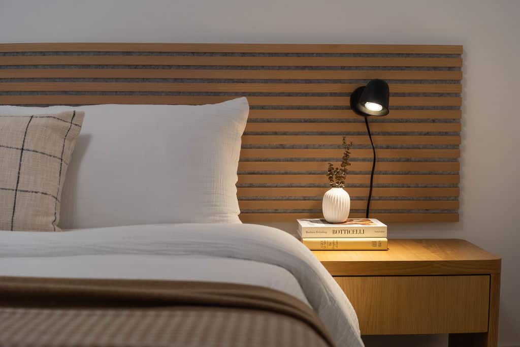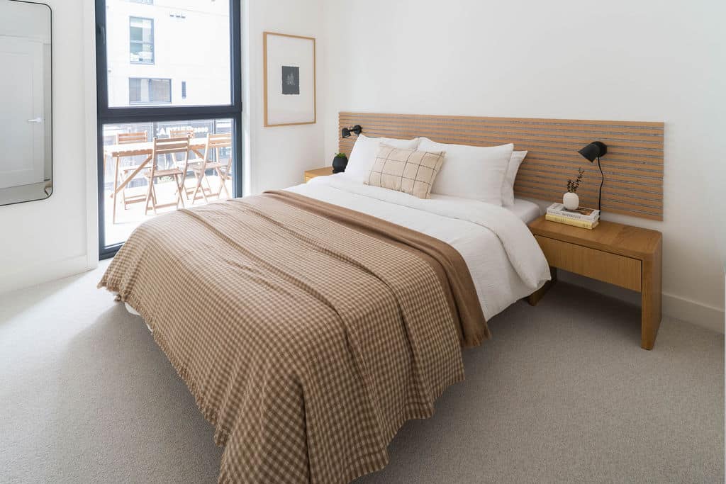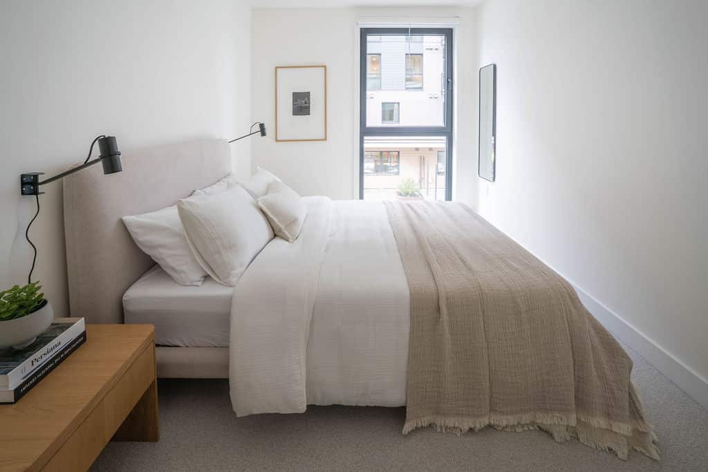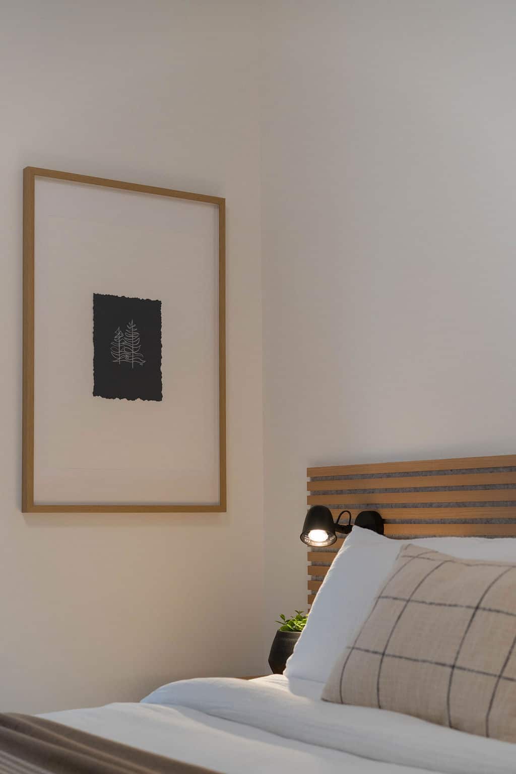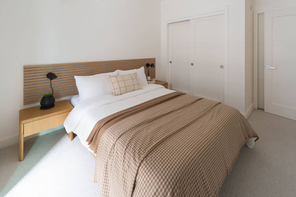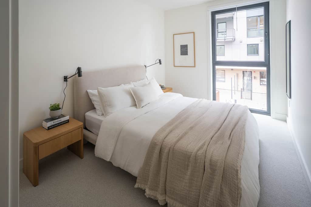 Bedroom 1: Queen bed with soft linens and warm, neutral finishes