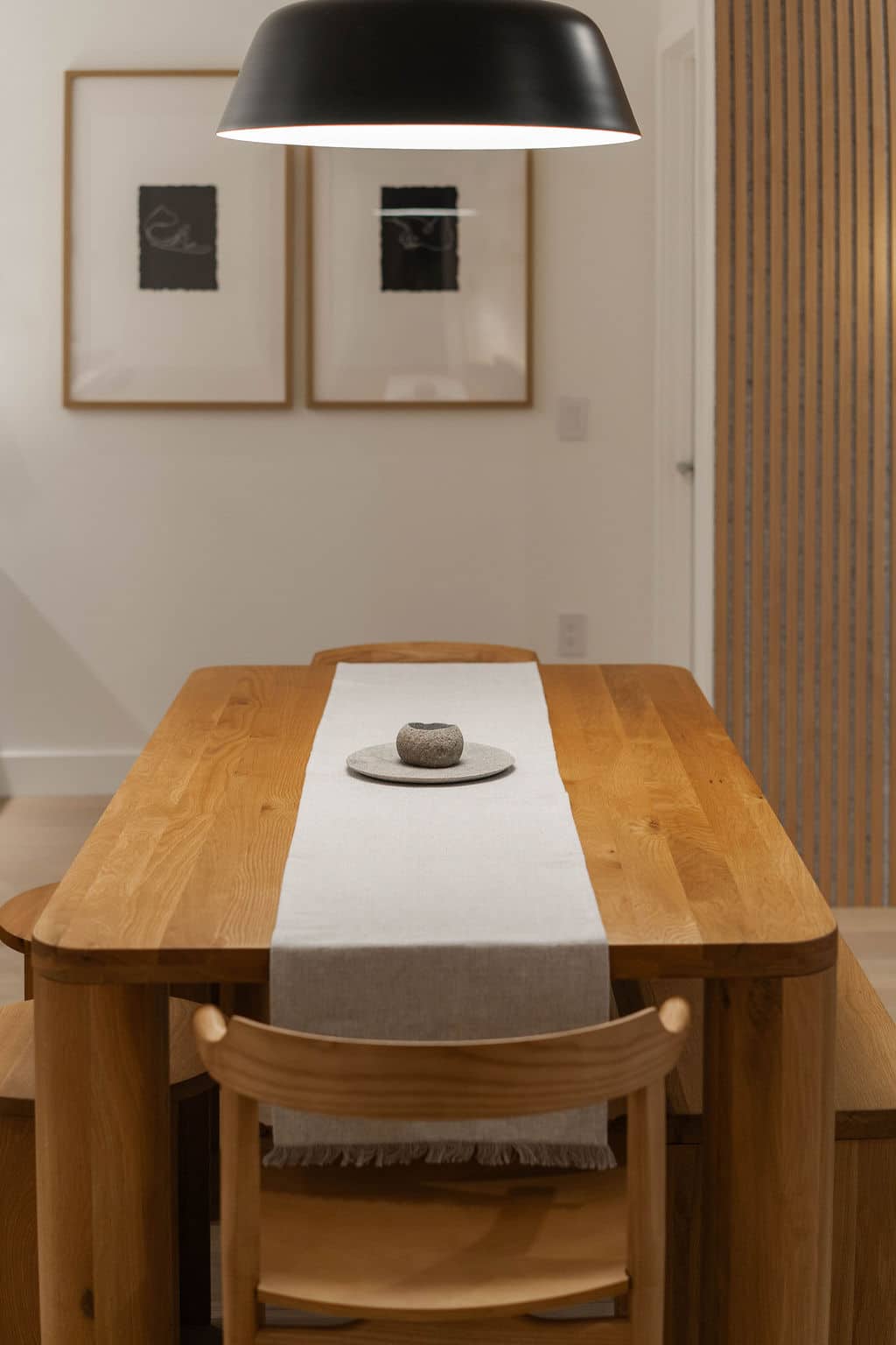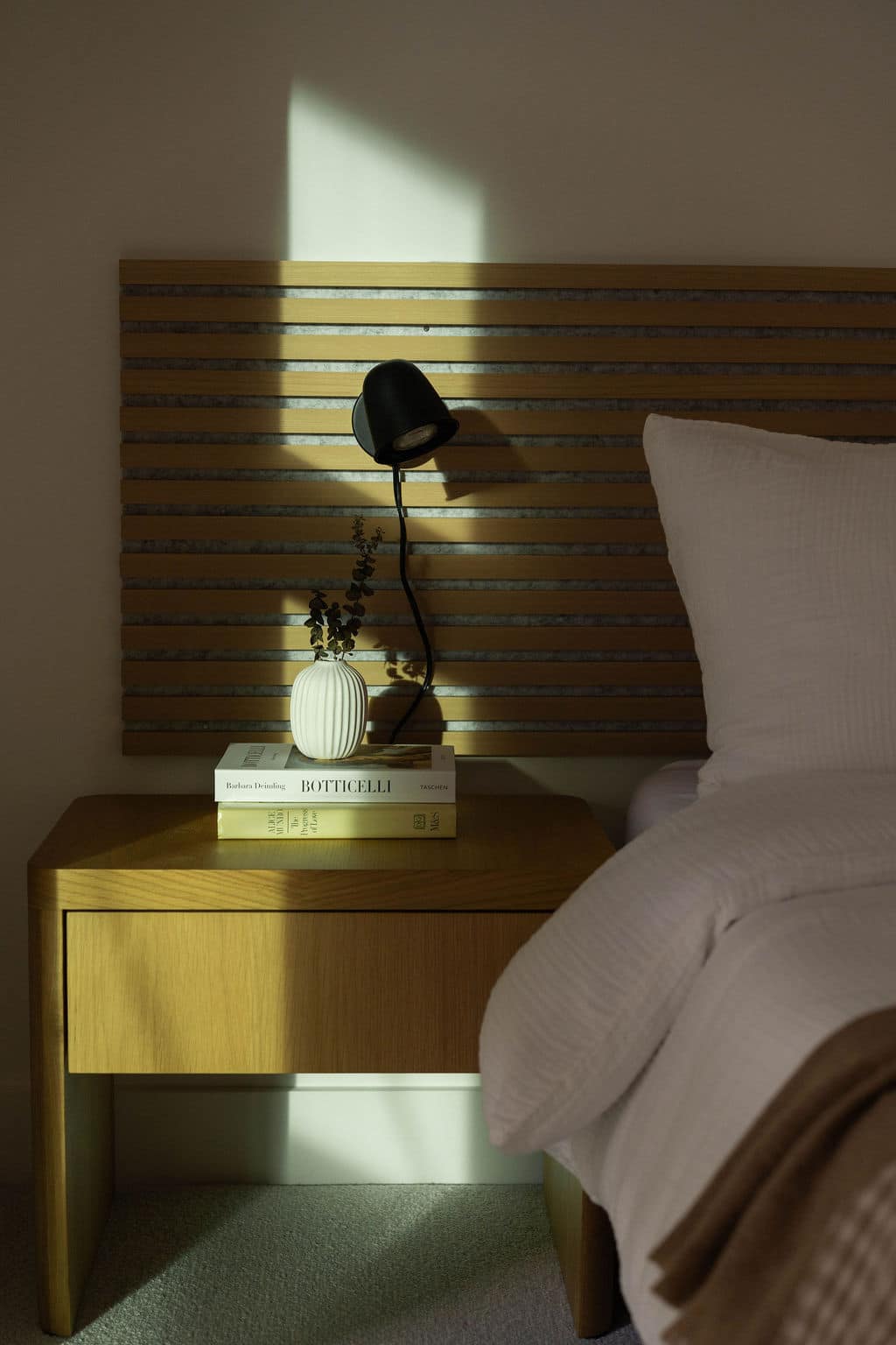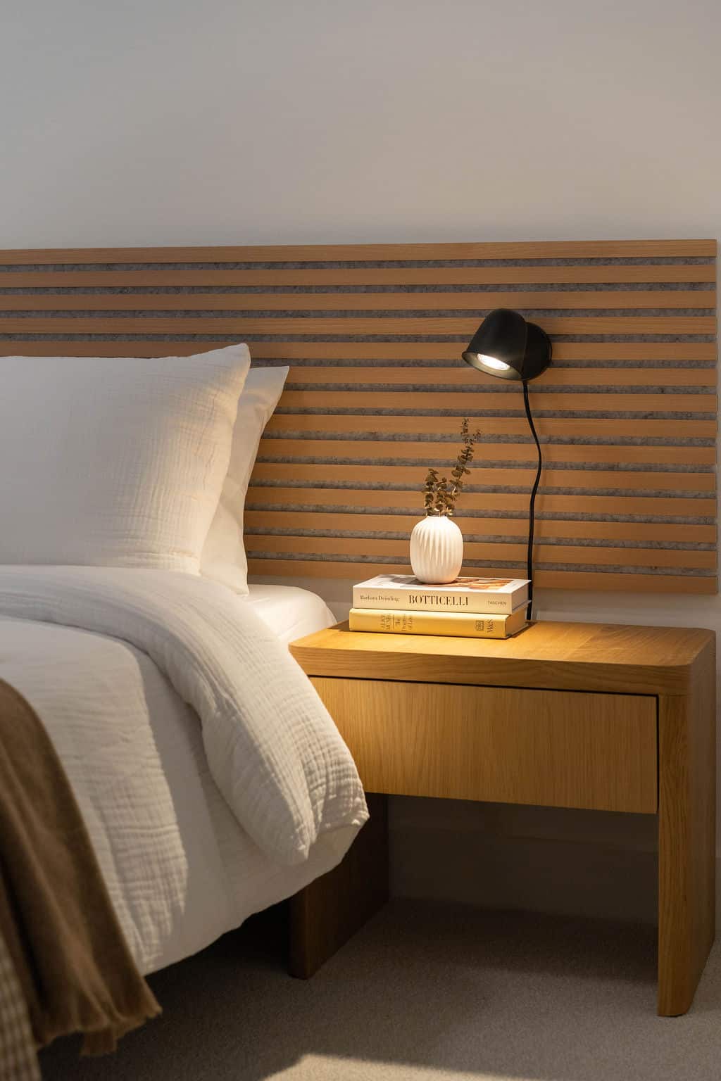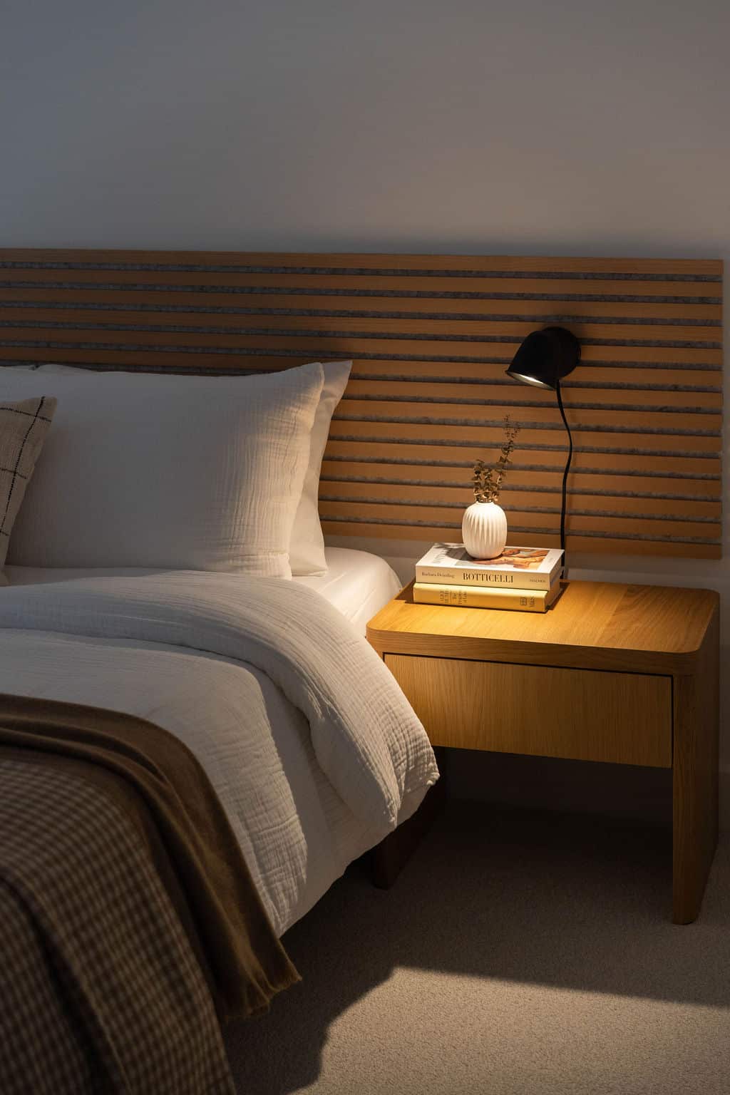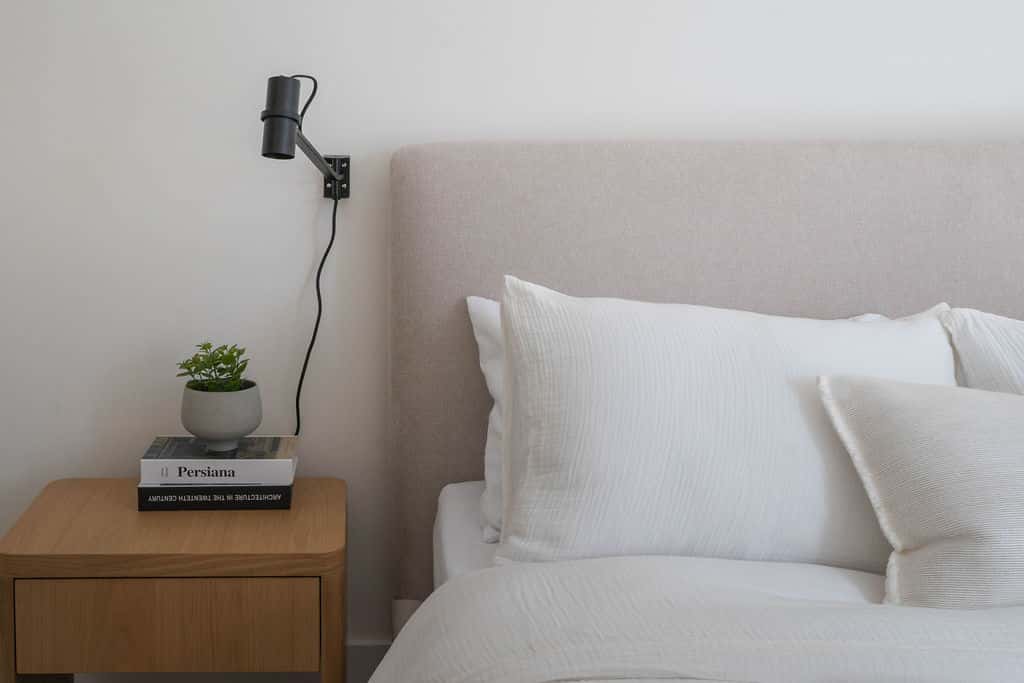 Bedroom 1: Queen bed with soft linens and warm, neutral finishes