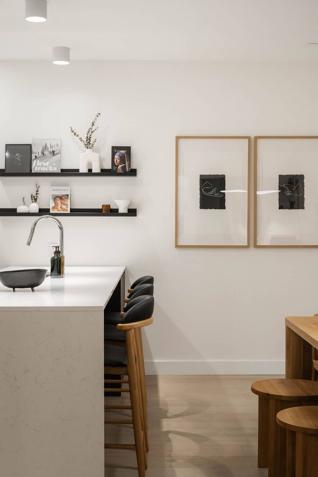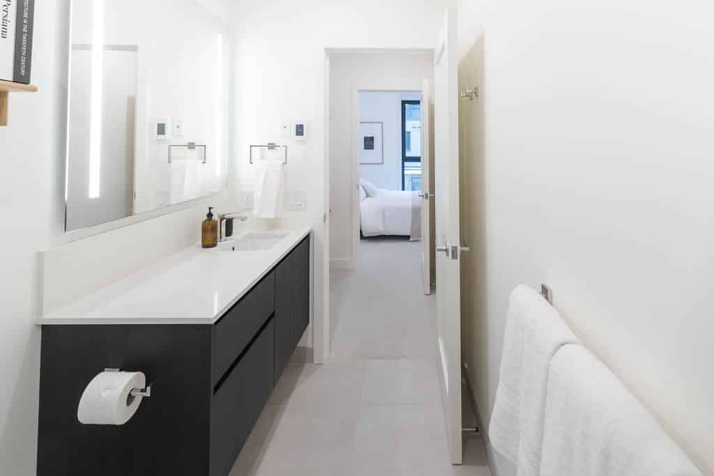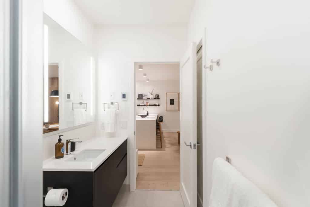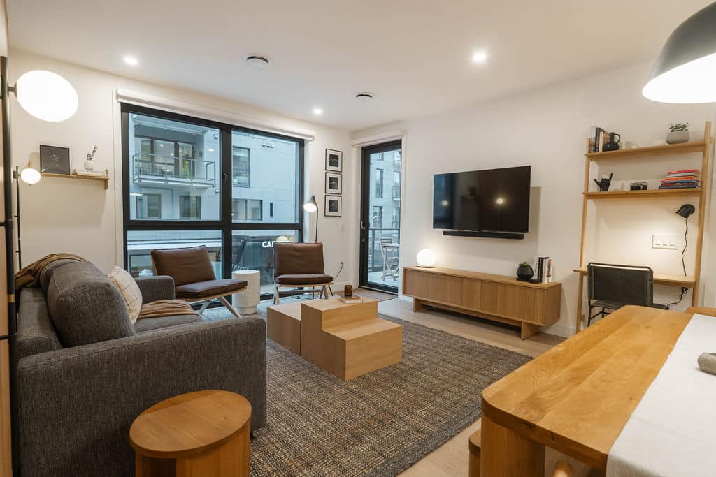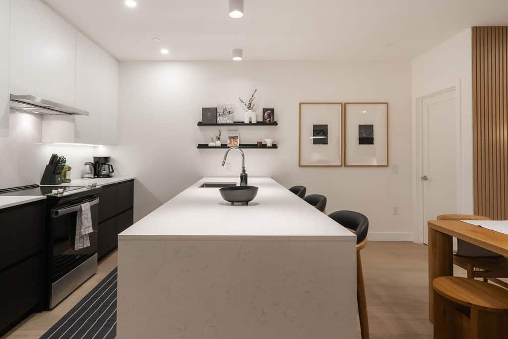 The open-concept living area invites you to unwind after a day outdoors, featuring a large smart TV and a curated, minimalist aesthetic. The fully stocked kitchen is as functional as it is beautiful, equipped with premium appliances. Coffee beans, tea, sugar, cooking essentials, and quality hair and body care products are all provided for a seamless stay.