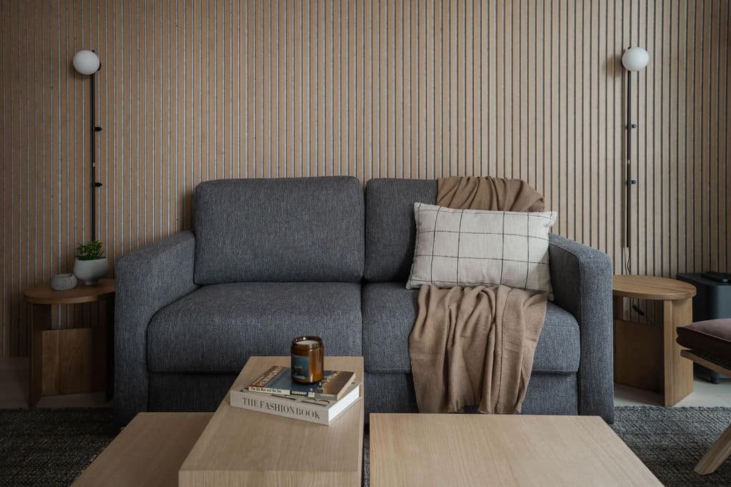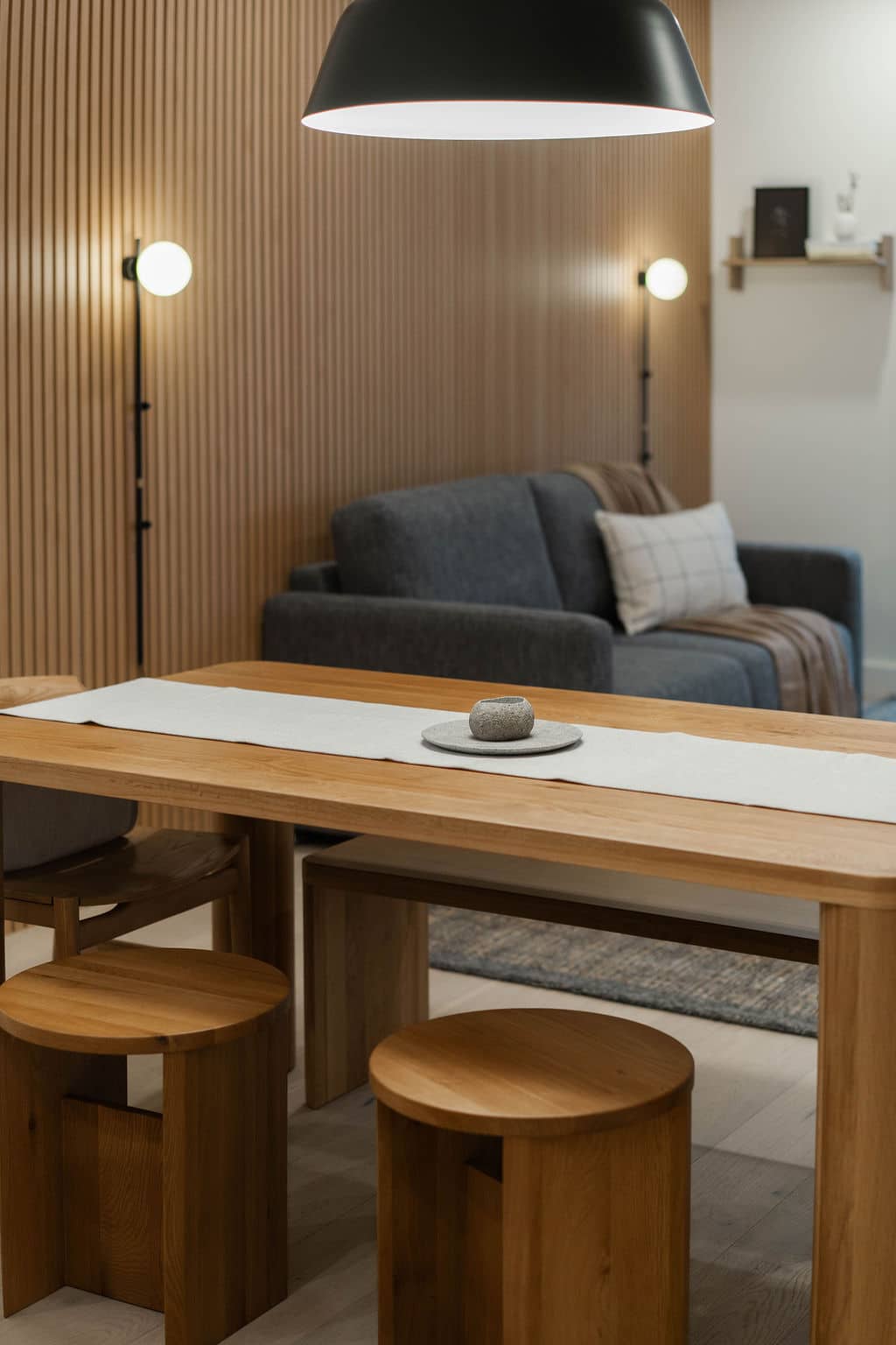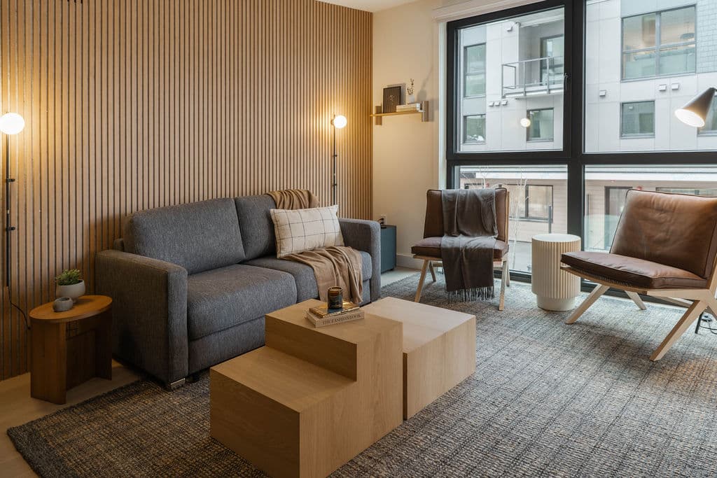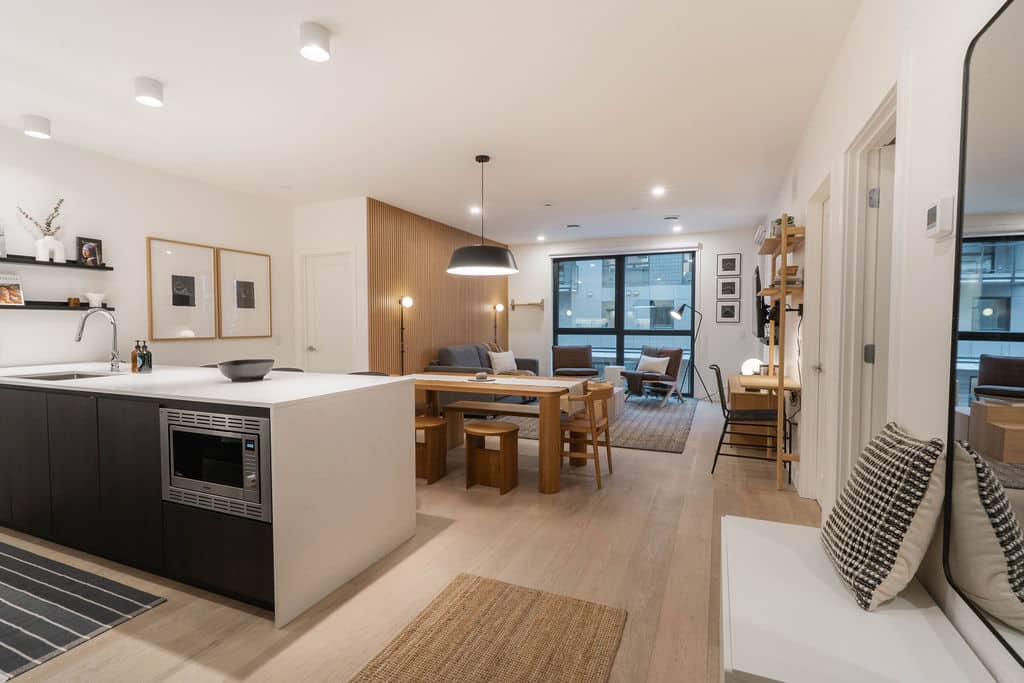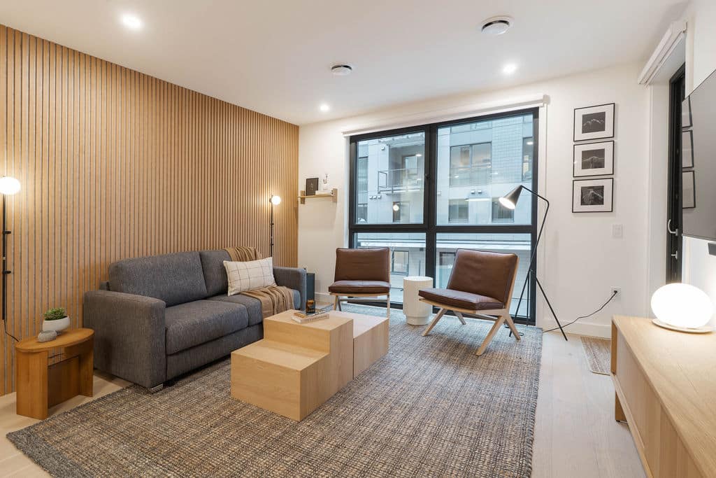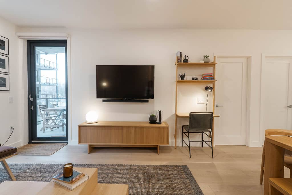 The RMAC Property is a thoughtfully interior-designed 2-bedroom, 2-bathroom condo located in the 2000 McCrae Building in Mackenzie Village, just minutes from Revelstoke Mountain Resort. The space blends warm wood tones, monochromatic décor, and clean lines to create a calm, refined mountain retreat.